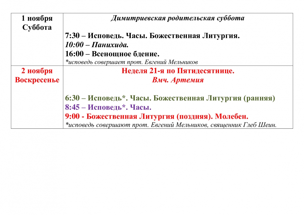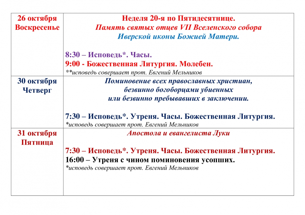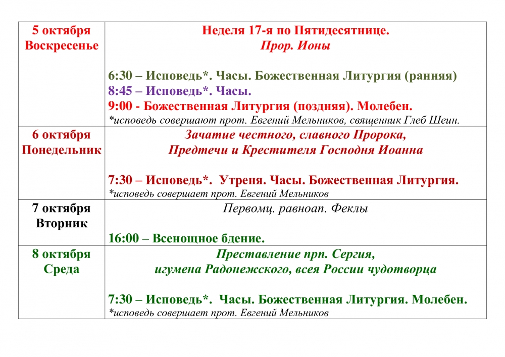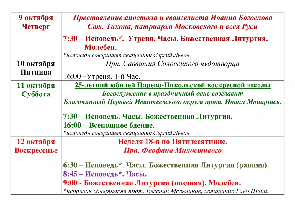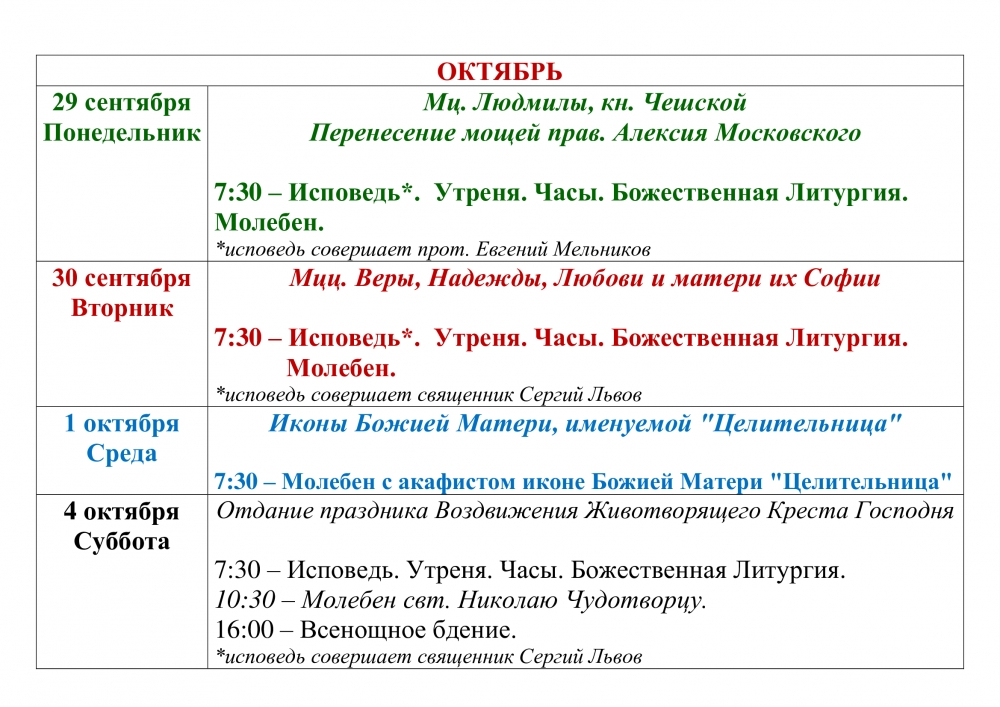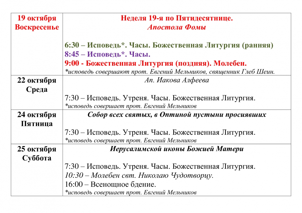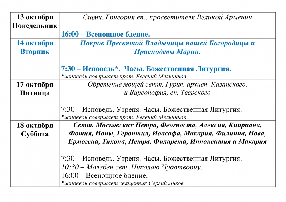 Расписание Богослужений